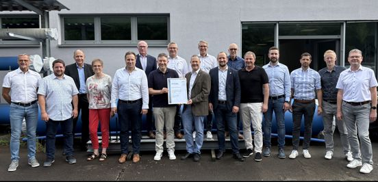 Übergabe der TSM-Urkunde durch Stefan Neuschwander, Geschäftsführer der DVGW-Landesgruppe Saarland, an den Verbandvorsteher des Zweckverbands Wasserversorgung, Landrat Sören Meng (7.v.l.).