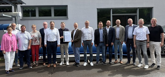 Übergabe der TSM-Urkunde durch Stefan Neuschwander, Geschäftsführer der DVGW-Landesgruppe Saarland, an den Aufsichtsratsvorsitzenden der WVO GmbH, Landrat Sören Meng (7.v.l.).
